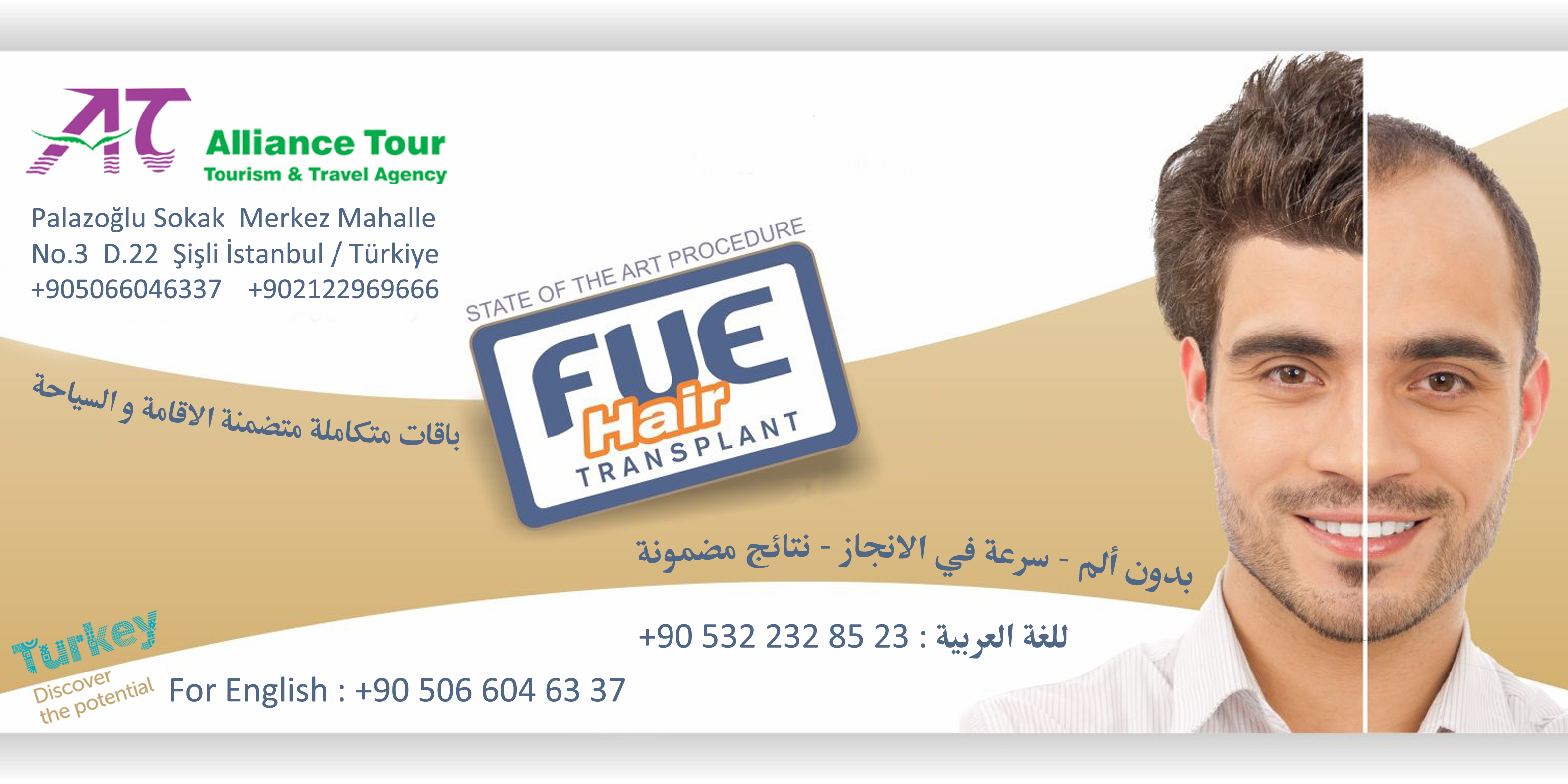 قامت شركة آليانس للسياحة و السفر بعمل اتفاقيات مع افضل مستشفيات اسطنبول ذات الشهرة بعمليات زراعة الشعر ( شعر الرأس ، الحاجب ، الذقن .... )